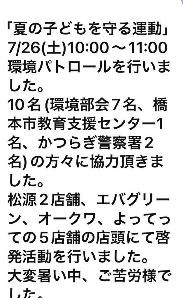 青少年が夢と希望を持ち続け、心身ともに健やかに、たくましく成長していくことは、私たちみんなの願いです。しかしながら、少子高齢化、核家族化、情報化、国際化等が進み、家庭、学校、職場、地域等の社会環境は大きく変化し、青少年の行動にも大きく影響を及ぼしています。和歌山県においては、夏の子どもを守る運動を7月1日~8月31日の間行っています。高野口町青少年健全育成会も7月26日(土)に地域の子供は地域で守り育てるための環境パトロールを高野口町内の各店舗にて、チラシ及びティシュ配布し啓発活動を行います。夏休みは、子どもたちにとって、開放的な気持ちになる時期です。子どもたちが、誘惑や危険に巻き込まれることのないよう、地域やご家庭での見守りをよろしくお願いいたします。啓発活動にご協力頂ける方は、下記場所・時刻にご集合お願いします。