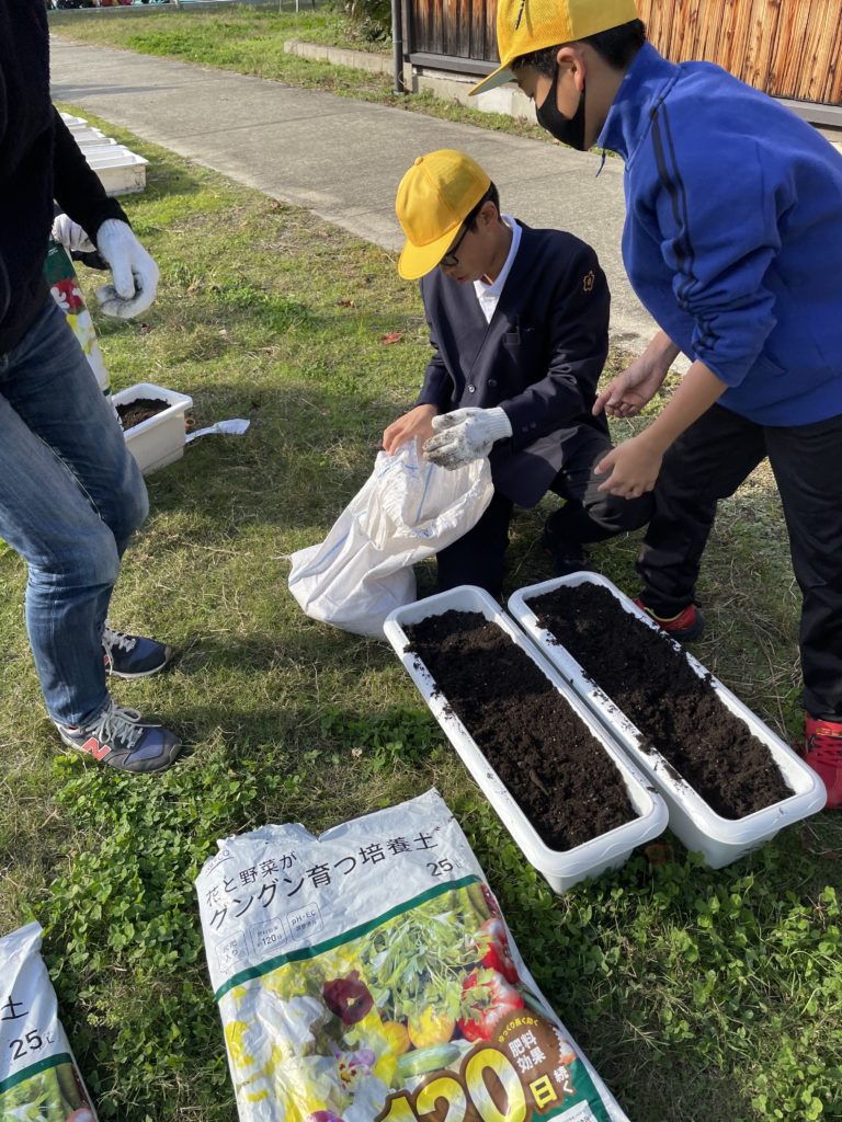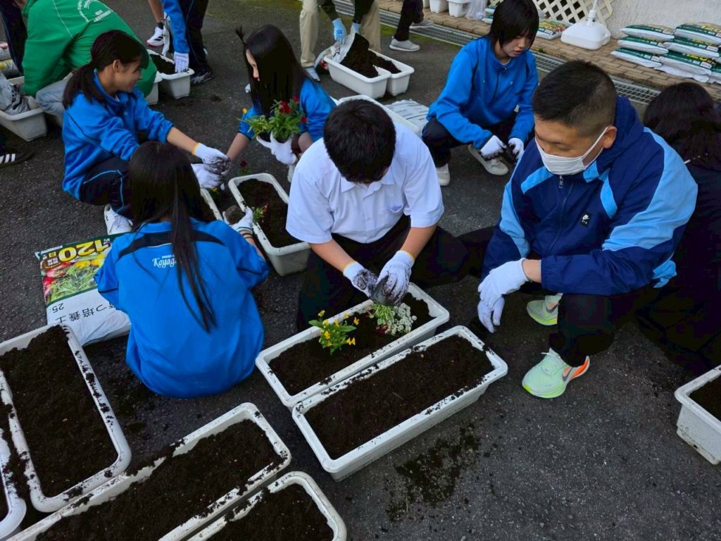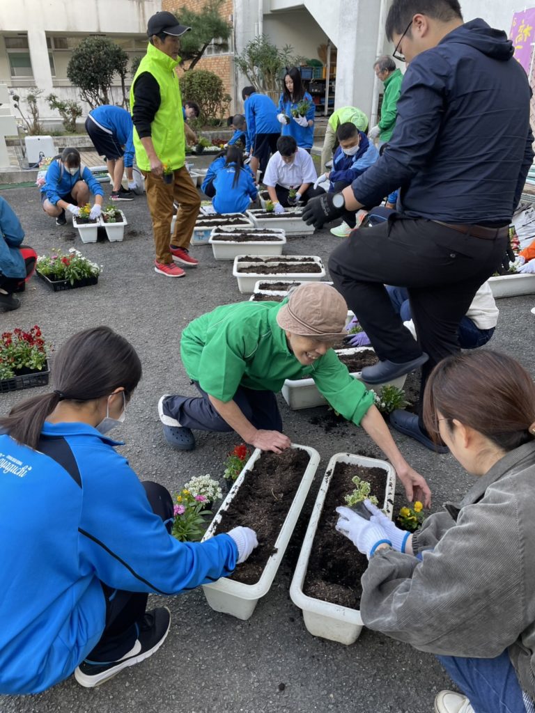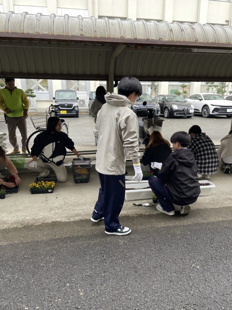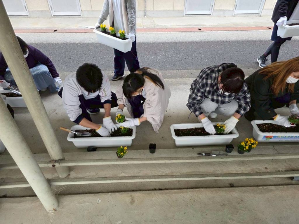 生徒30名・育成会8名・共コミ2名・人権3名・公民館2名の皆さんが参加して頂きました。伊都中央高校学校から頂いたチューリップの球根を配布しました。参加して頂いた皆さんと生徒と共に一緒にパンジーを植えました。橋本市の堆肥肥料を使用しました。