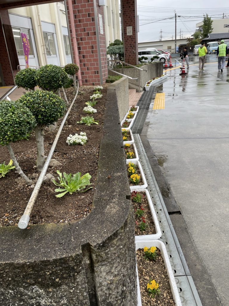 生徒20名・学校職員4名・育成会5名・共コミ2名・人権3名の皆さんが参加して頂きました。パンジー以外に学校にて用意して頂いたチューリップの球根も植えました。