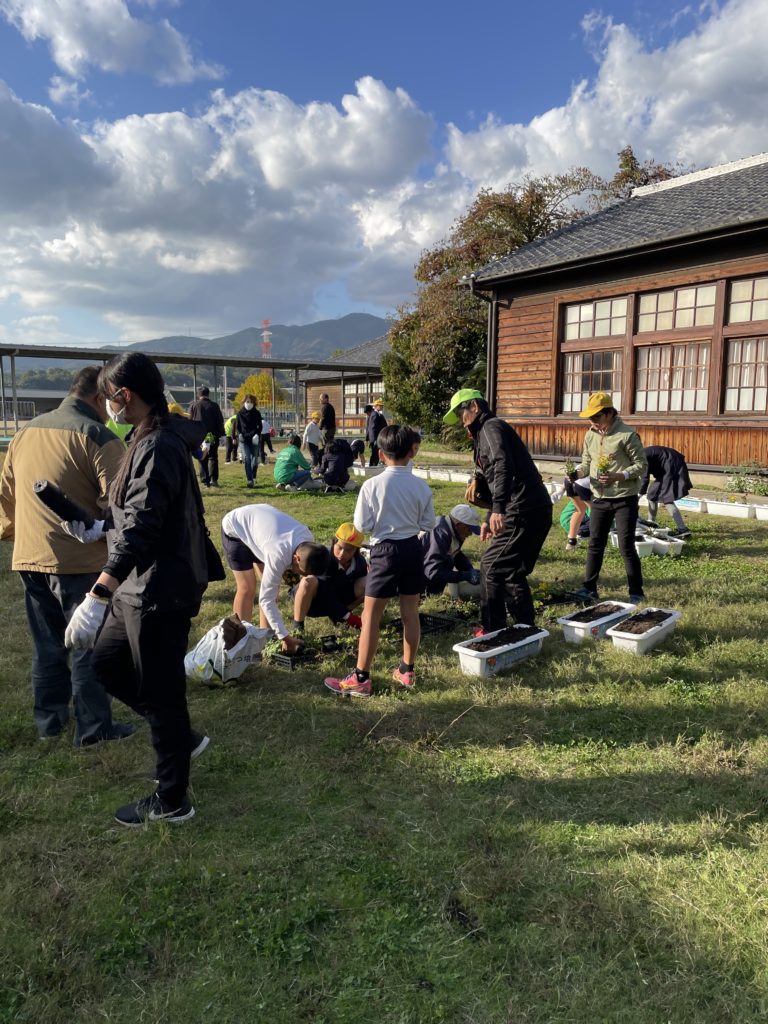学校職員5名・育成会6名・共コミ2名・人権4名・産文1名の皆さんが参加して頂きました。伊都中央高校学校から頂いたチューリップの球根を配布しました。参加して頂いた皆さんと児童と共に一緒にパンジーを植えました。