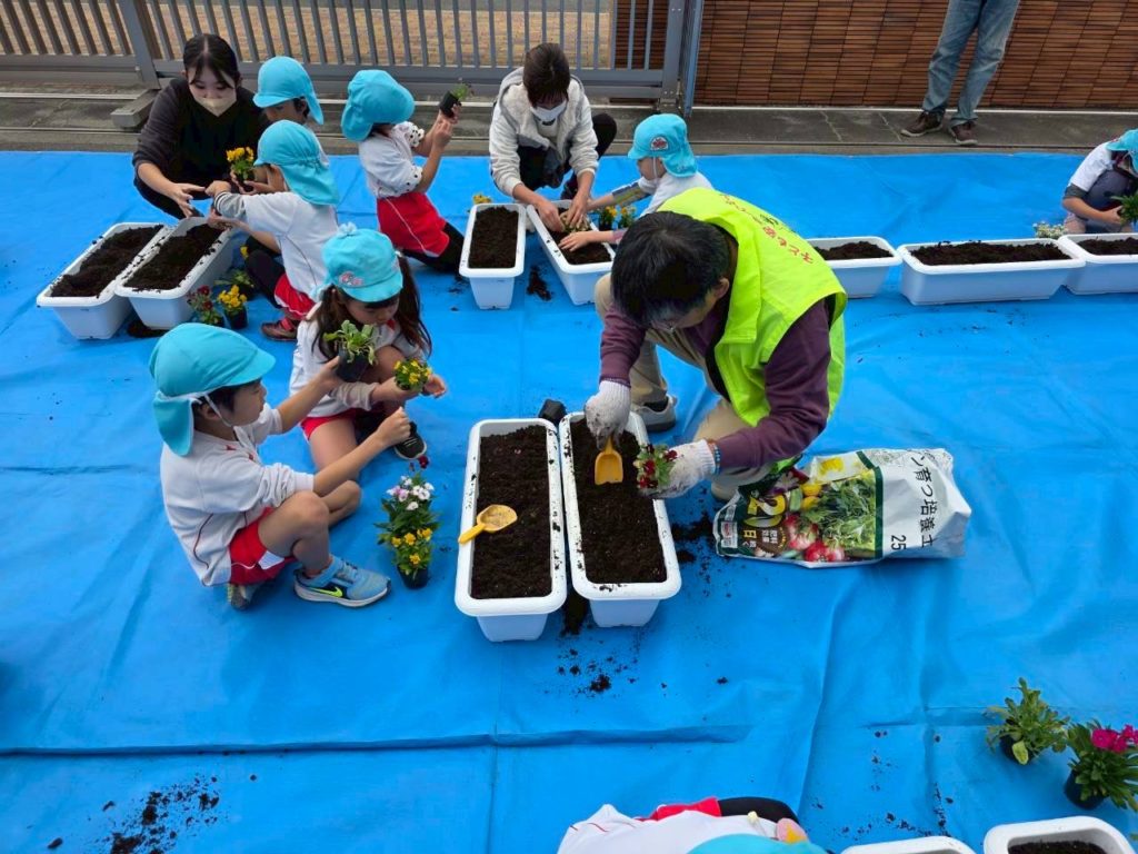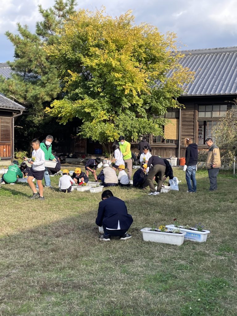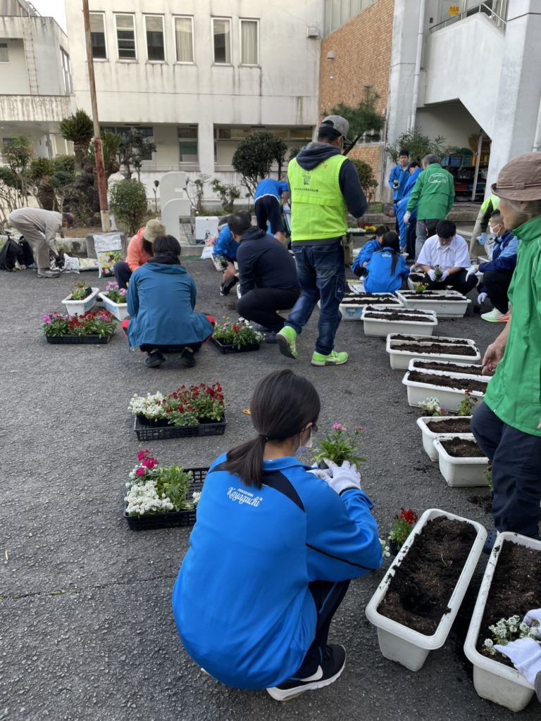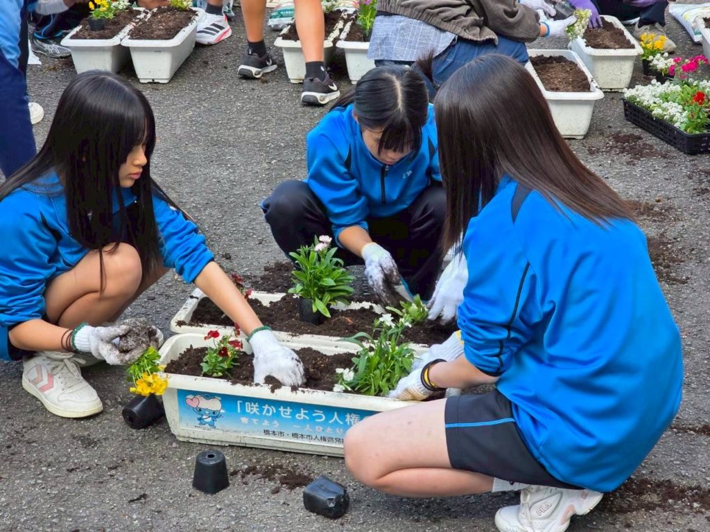 町内の子ども園・きのかわ支援学校・小中学校の児童生徒・伊都中央高等学校と花植え交流会を行います。パンジーを児童生徒と一緒に植え、交流を深めると同時に、学校の美化に努めます。「花植え交流会は、橋本市人権啓発推進委員会(高野口地区・信太地区・応其地区)共育コミュニティーの共催事業として実施しています。植えた花は、学校だけでなく、以下の場所等にも置きます。『高野口駅・・高野口地区公民館・産業文化会館・友愛児童館・伏原文化センター・名古曽児童館・名古曽文化センター・高野口駅』