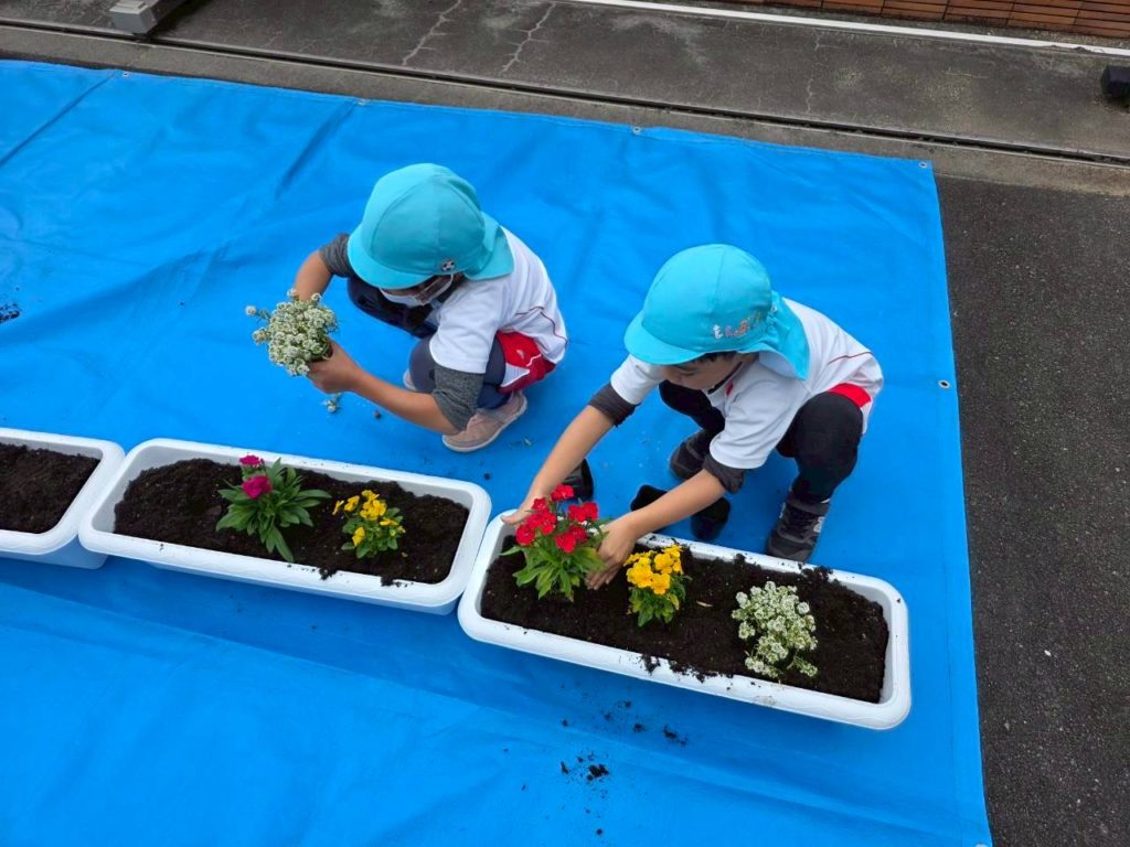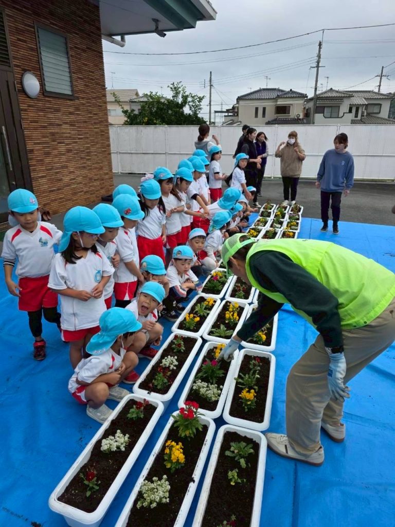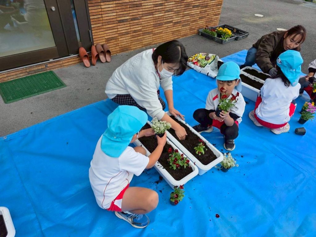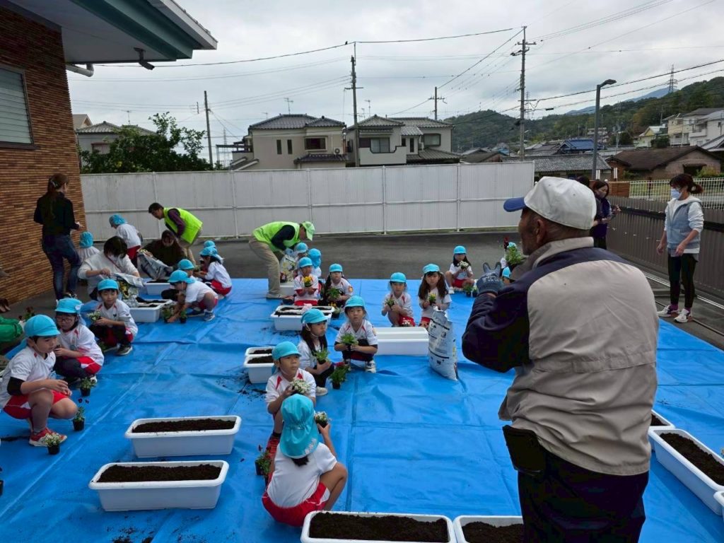 園児28名・育成会6名・共コミ2名・人権2名・の皆さんが参加して頂きました。参加して頂いた皆さんと園児と共に一緒にパンジーを植えました。