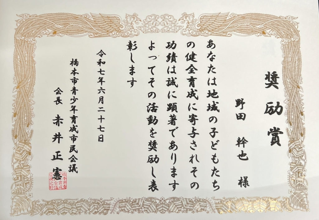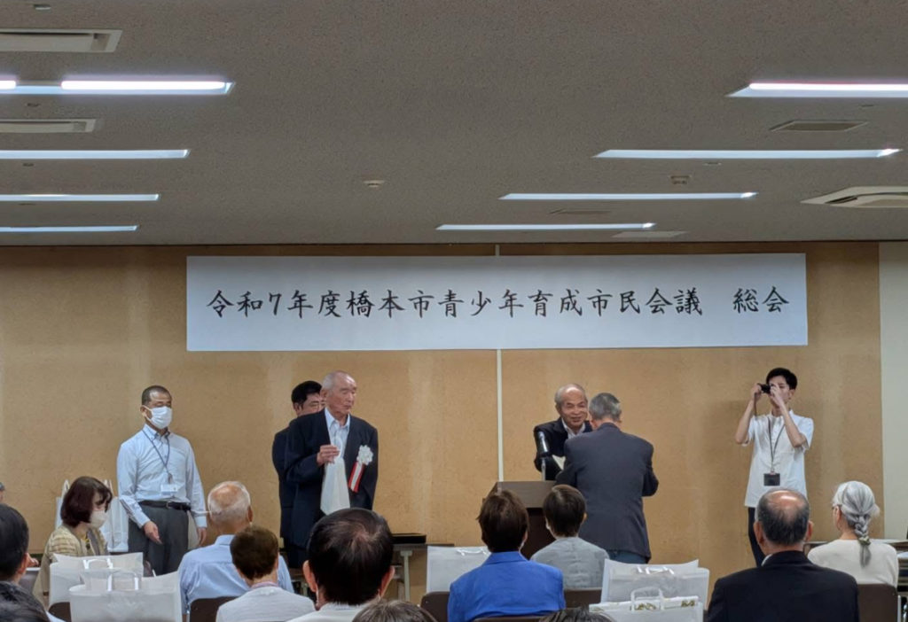 令和7年度 橋本市青少年育成会総会が6月27日午後7時から橋本市教育文化会館において開催され市長感謝状及び市民会議会長表彰を受賞されました。青少年健全育成活動及び登下校時の安全安心な活動を長年にわたり子ども達のご指導に対しまして今回受賞されました。